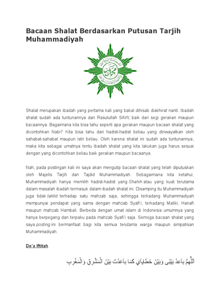 Hal ini demikian kerana membaca tahiyat termasuk salah satu dalam rukun solat. Itulah yang dapat kami berikan mengenai bacaan tahiyat awal dan tahiyat akhir pada bab shalat kali ini. Dulu waktu kelas 3 6 sd saya pelajari bacaan sholat ini di sekolah mengaji saya muhammadiyah. Bacaan sholat yang telah diputuskan oleh majelis tarjih dan tajdid muhammadiyah hanya memilih hadist hadist yang shahih atau yang kuat.