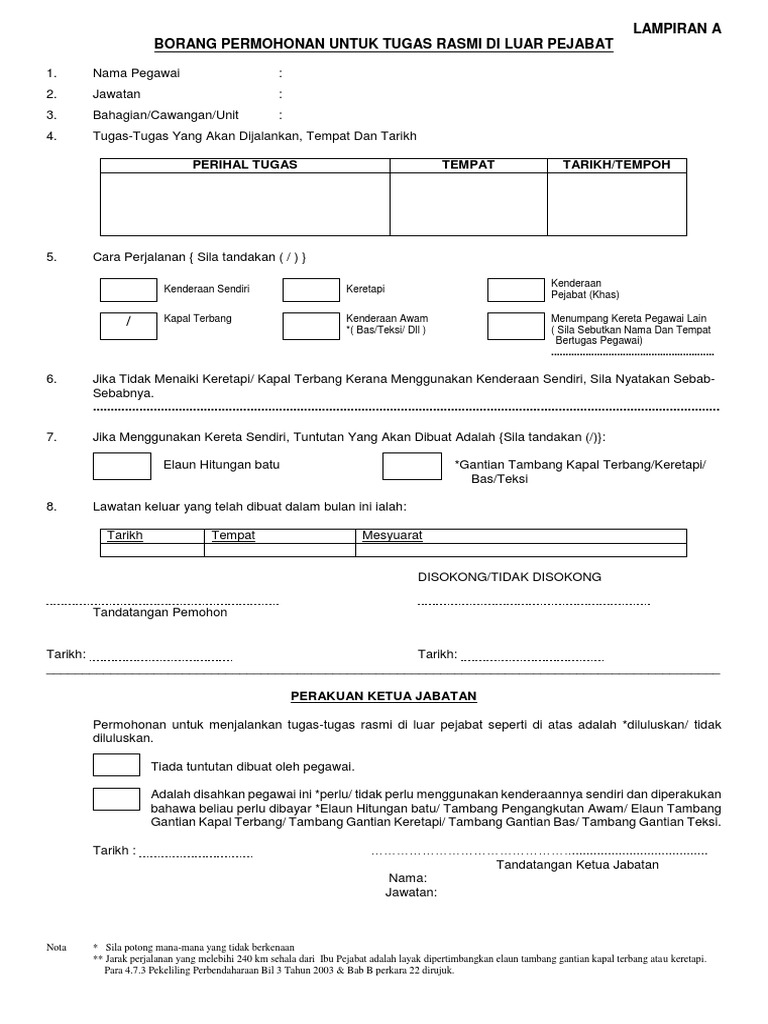 Lampiran A Borang Permohonan Untuk Tugas Rasmi Di Luar Pejabat