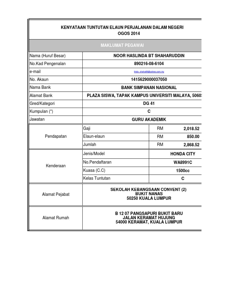 Nama alamat bank. Lampiran c borang tuntutan elaun perjalanan dalam negeri bagi bulan tahun 0 80 7 3 nama huruf besar. 2 5 kenyataan tuntutan tarikh waktu tujuan tempat jarak bertolak sampai km. Salinan slip gaji terkini.