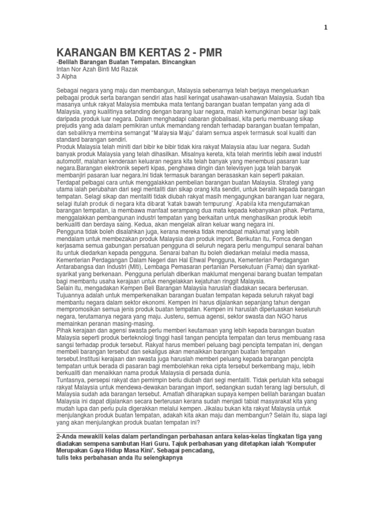 Apabila seseorang membeli produk malaysia secara berterusan ia akan menjadi kelaziman atau kebiasaan bagi orang itu. Kamu mewakili sekolah kamu dalam satu pertandingan syarahan peringkat daerah sempena kempen membeli barangan buatan tempatan. Karangan spm 2 2011 barangan buatan malaysia a kepentingan pembelian barangan tempatan pendahuluan. Salah satu kepentingan membeli keluaran tempatan ialah membantu menaikkan taraf ekonomi negara.