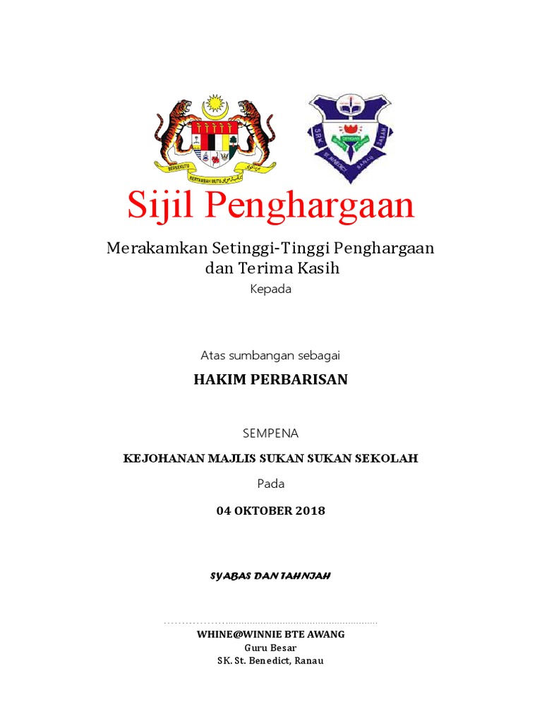 15 contoh surat penghargaan dan terima kasih kepada menteri terlengkap 2019. 09 7652276 fax. Sempena kejohanan olahraga majlis sukan sekolah smk tambunan msssmkt kali ke xxxv pada 16 dan 17 januari 2007. Contoh sijil penghargaan dan watikah perlantikan prs dan pengawas logo sekolah.